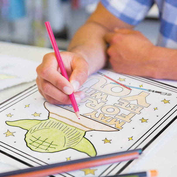 Who shot first! This gift set includes a pack of 12 colored pencils inspired by your favorite Star Wars characters and quotes. Each pencil is hand-stamped with foil with funny references to the saga. Use your new colored pencil set to create frame-worthy works of art on our coloring pages.